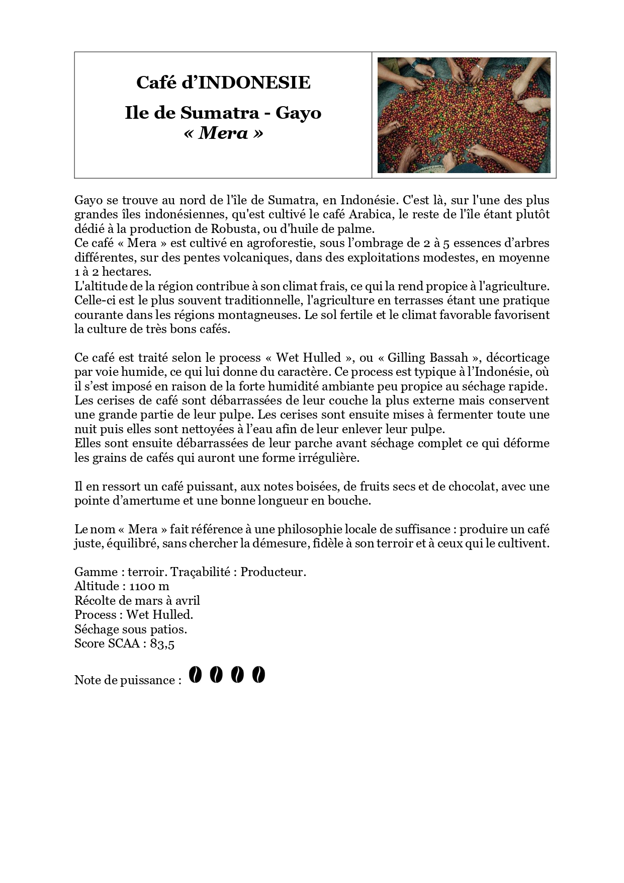 Tous nos cafés sont issus de la filière des cafés dits « de spécialité », c’est-à-dire des cafés de qualité supérieure, cultivés, récoltés et préparés avec la plus grande rigueur et ayant obtenu une notation supérieure à 80/100 selon un barème très strict établi par la SCAA (Speciality Coffee Association of America).